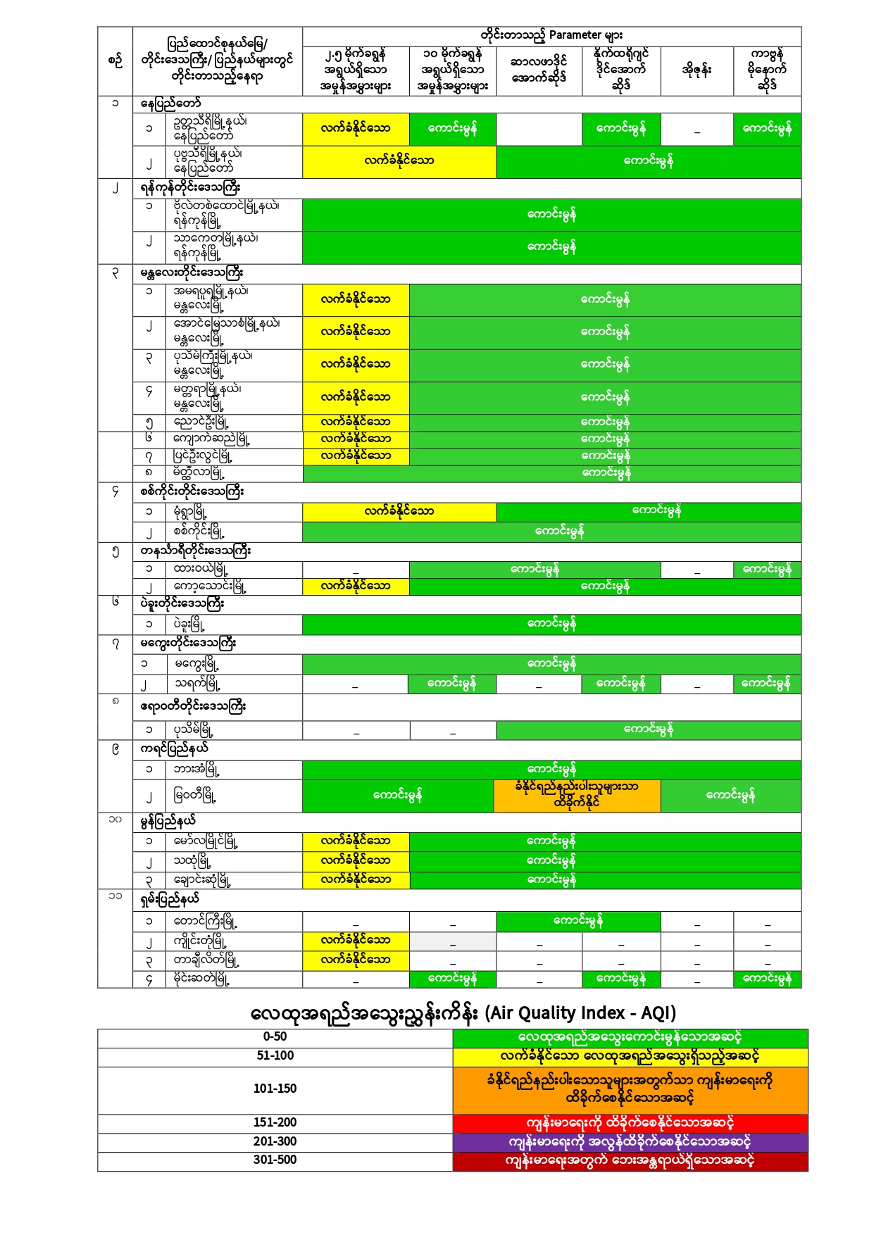 မြန်မာနိုင်ငံတစ်ဝှမ်းရှိ ဝန်းကျင်လေထုအရည်အသွေးအခြေအနေအား လေ့လာဆန်းစစ် နိုင်ရန်အတွက် ပတ်ဝန်းကျင်ထိန်းသိမ်းရေးဦးစီးဌာနအနေဖြင့် ပြည်ထောင်စုနယ်မြေ/ တိုင်း ဒေသကြီး/ ပြည်နယ်များရှိ သတ်မှတ် Sampling Point နေရာများတွင် ဝန်းကျင်လေထု အရည်အသွေးကို Environmental Perimeter Air Station (EPAS) – Haz-Scanner၊ Air Quality Monitoring Station (AQM-65)၊ Scentroid (SL – 50 Scential)၊ Aeroqual (Series – 500 Portable Air Quality Monitor)၊ AQMesh (Dust Analyzer – 1941150)၊ (Gas Analyzer – 1940150)၊ Portable Beta Attenuation Mass Monitor (BAM 1022)၊ Air Quality Monitoring Station (AQMS) နှင့် Continuous Particulate Monitor များအသုံးပြု၍ Particulate Matter 2.5 (PM2.5)၊ Particulate Matter 10 (PM10)၊ Sulphur Dioxide (SO2) ၊ Nitrogen Dioxide (NO2)၊ Ozone (O3) နှင့် Carbon Monoxide (CO) စသည့် အဓိက Parameter များကို ပုံမှန်တိုင်းတာပြီး လေ့လာဆန်းစစ်လျက်ရှိပါသည်။