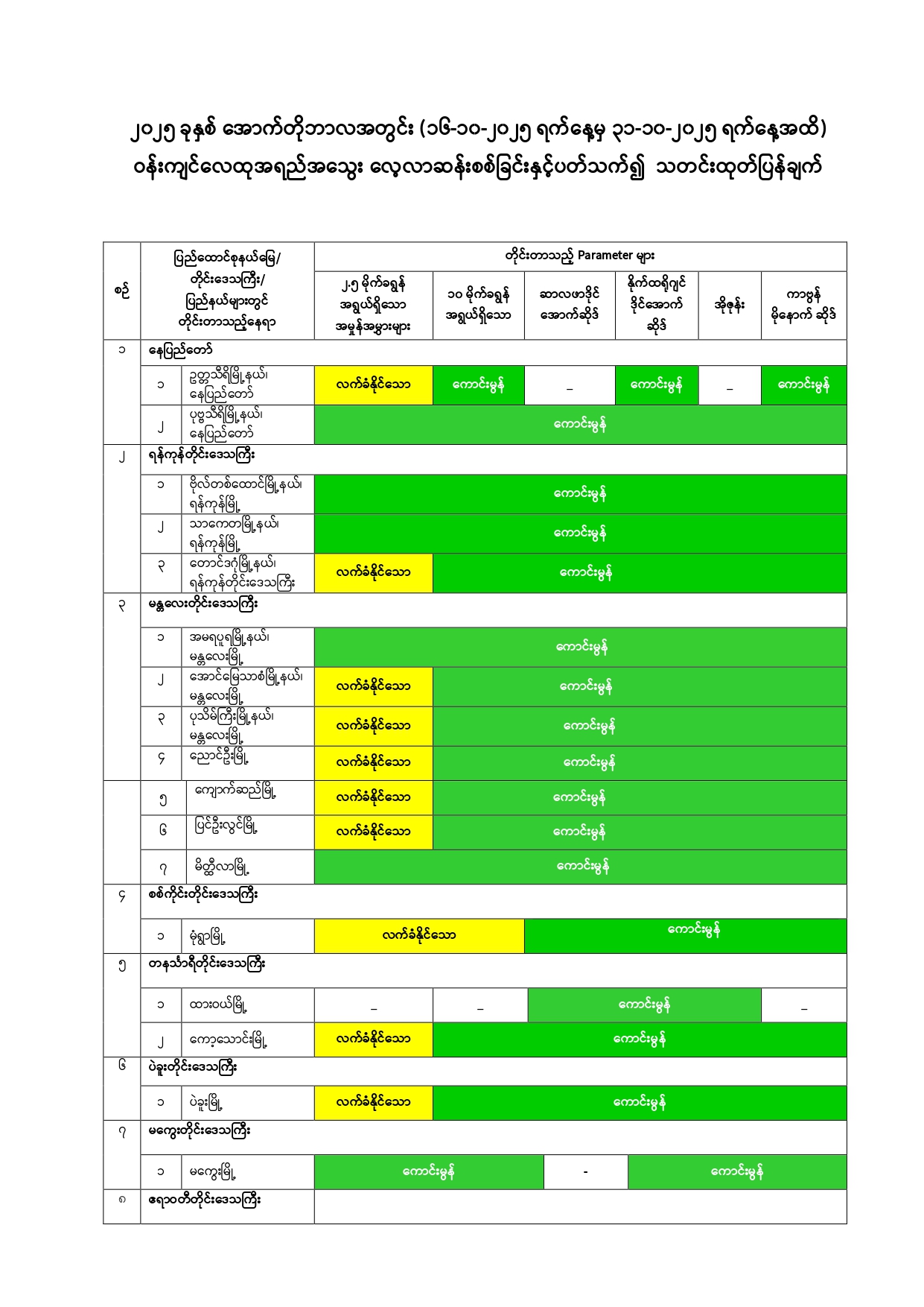 ၂၀၂၅ ခုနှစ် အောက်တိုဘာလအတွင်း (၁၆-၁၀-၂၀၂၅ ရက်နေ့မှ ၃၁-၁၀-၂၀၂၅ ရက်နေ့အထိ) ဝန်းကျင်လေထုအရည်အသွေး လေ့လာဆန်းစစ်ခြင်းနှင့်ပတ်သက်၍ သတင်းထုတ်ပြန်ချက်