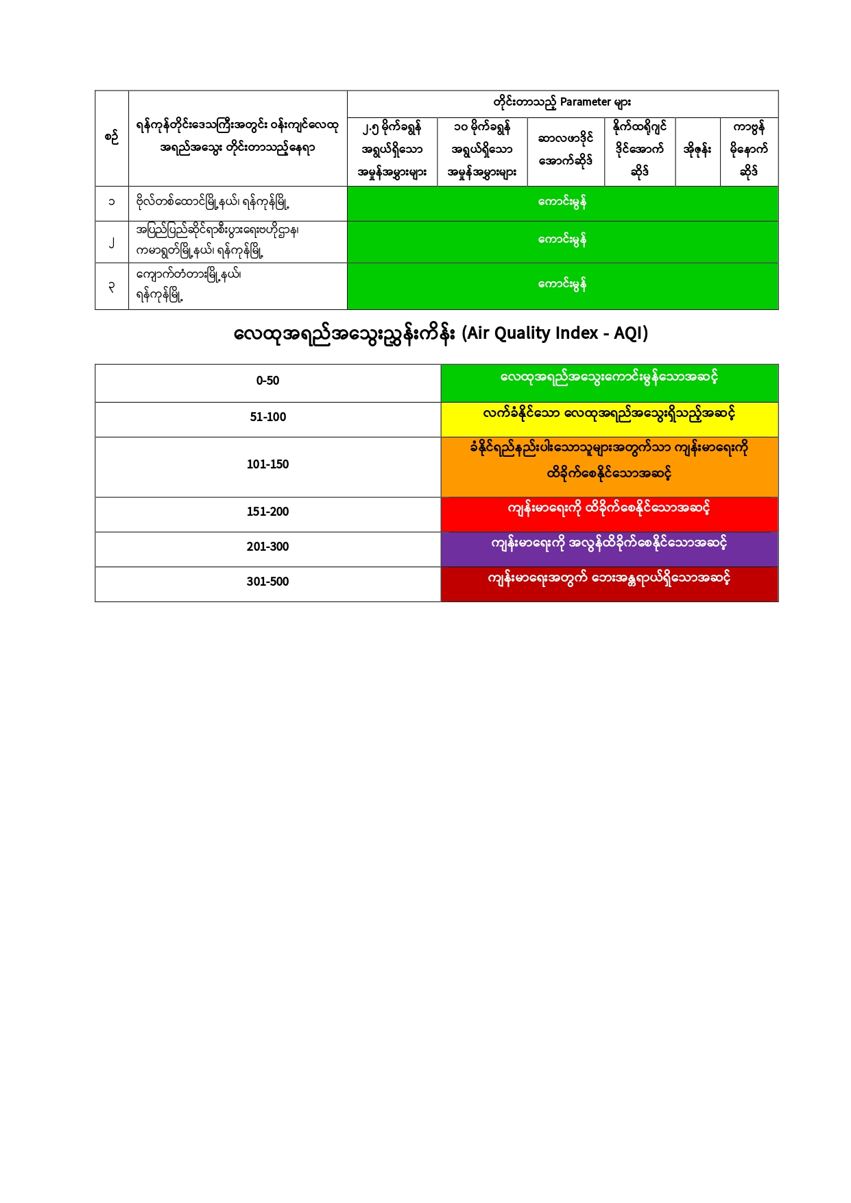 ရန်ကုန်တိုင်းဒေသကြီး၊ ပတ်ဝန်းကျင်ထိန်းသိမ်းရေးဦးစီးဌာနအနေဖြင့် ရန်ကုန်မြို့အတွင်း အောက်ဖော်ပြပါ တိုင်းတာမှတ် (၃) နေရာတွင် Ambient Air Quality Monitoring Station with Mobile Car- (AQMS Mobile Car)၊ Compact Air Quality Monitoring Station- (AQM 65) စက်များကိုအသုံးပြု၍ Particulate Matter 2.5 (PM2.5)၊ Particulate Matter 10 (PM10) ၊ Sulphur Dioxide (SO2)၊ Nitrogen Dioxide (NO2)၊ Ozone (O3) နှင့် Carbon Monoxide (CO) စသည့် အဓိက Parameter (၆) မျိုးကို (၂၄) နာရီ ပုံမှန်တိုင်းတာပြီး လေ့လာဆန်းစစ်လျက်ရှိပါသည်။