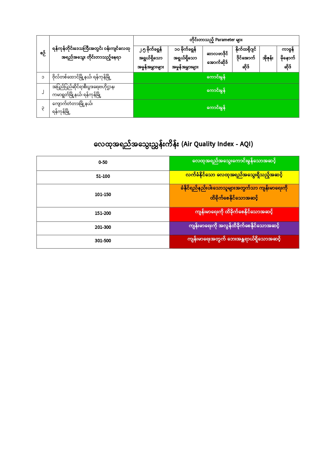 ရန်ကုန်တိုင်းဒေသကြီး၊ ပတ်ဝန်းကျင်ထိန်းသိမ်းရေးဦးစီးဌာနအနေဖြင့် ရန်ကုန်မြို့အတွင်း အောက်ဖော်ပြပါ တိုင်းတာမှတ် (၃) နေရာတွင် Ambient Air Quality Monitoring Station with Mobile Car- (AQMS Mobile Car)၊ Compact Air Quality Monitoring Station- (AQM 65) စက်များကိုအသုံးပြု၍ Particulate Matter 2.5 (PM2.5)၊ Particulate Matter 10 (PM10) ၊ Sulphur Dioxide (SO2)၊ Nitrogen Dioxide (NO2)၊ Ozone (O3) နှင့် Carbon Monoxide (CO) စသည့် အဓိက Parameter (၆) မျိုးကို (၂၄) နာရီ ပုံမှန်တိုင်းတာပြီး လေ့လာဆန်းစစ်လျက်ရှိပါသည်။