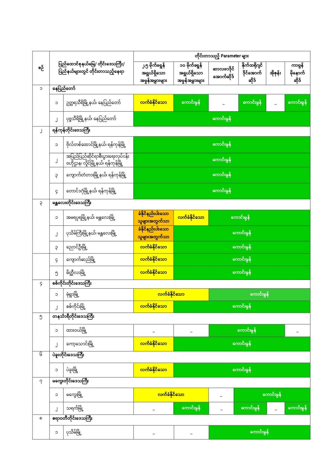 မြန်မာနိုင်ငံတစ်ဝှမ်းရှိ ဝန်းကျင်လေထုအရည်အသွေးအခြေအနေအား လေ့လာဆန်းစစ် နိုင်ရန်အတွက် ပတ်ဝန်းကျင်ထိန်းသိမ်းရေးဦးစီးဌာနအနေဖြင့် ပြည်ထောင်စုနယ်မြေ/ တိုင်းဒေသကြီး/ ပြည်နယ်များရှိ သတ်မှတ် Sampling Point နေရာများတွင် ဝန်းကျင် လေထုအရည်အသွေးကို Environmental Perimeter Air Station (EPAS) – Haz-Scanner၊ Air Quality Monitoring Station (AQM-65)၊ Scentroid (SL – 50 Scential)၊ Aeroqual (Series – 500 Portable Air Quality Monitor)၊ AQMesh (Dust Analyzer – 1941150)၊ (Gas Analyzer – 1940150)၊ Portable Beta Attenuation Mass Monitor (BAM 1022)၊ Air Quality Monitoring Station (AQMS) နှင့် Continuous Particulate Monitor များအသုံးပြု၍ Particulate Matter 2.5 (PM2.5)၊ Particulate Matter 10 (PM10)၊ Sulphur Dioxide (SO2) ၊ Nitrogen Dioxide (NO2)၊ Ozone (O3) နှင့် Carbon Monoxide (CO) စသည့် အဓိက Parameter များကို ပုံမှန်တိုင်းတာပြီး လေ့လာဆန်းစစ်လျက်ရှိပါသည်။