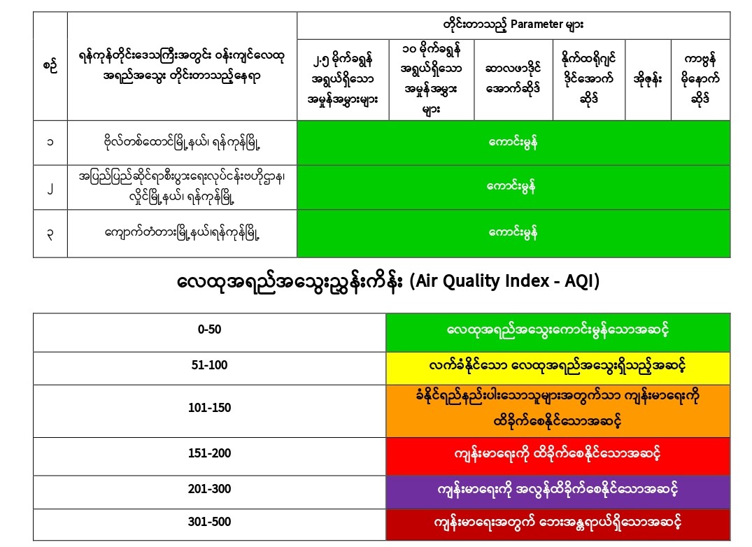 ရန်ကုန်တိုင်းဒေသကြီး၊ ပတ်ဝန်းကျင်ထိန်းသိမ်းရေးဦးစီးဌာနအနေဖြင့် ရန်ကုန်မြို့အတွင်း အောက်ဖော်ပြပါ တိုင်းတာမှတ် (၃) နေရာတွင် Ambient Air Quality Monitoring Station with Mobile Car- (AQMS Mobile Car)၊ Compact Air Quality Monitoring Station- (AQM 65) စက်များကိုအသုံးပြု၍ Particulate Matter 2.5 (PM2.5)၊ Particulate Matter 10 (PM10) ၊ Sulphur Dioxide (SO2)၊ Nitrogen Dioxide (NO2)၊ Ozone (O3) နှင့် Carbon Monoxide (CO) စသည့် အဓိက Parameter (၆) မျိုးကို (၂၄) နာရီ ပုံမှန်တိုင်းတာပြီး လေ့လာဆန်းစစ်လျက်ရှိပါသည်။