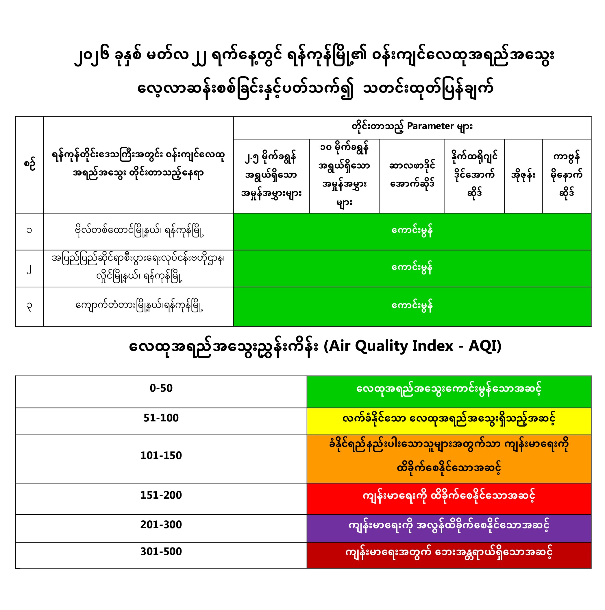 ရန်ကုန်တိုင်းဒေသကြီး၊ ပတ်ဝန်းကျင်ထိန်းသိမ်းရေးဦးစီးဌာနအနေဖြင့် ရန်ကုန်မြို့အတွင်း အောက်ဖော်ပြပါ တိုင်းတာမှတ် (၃) နေရာတွင် Ambient Air Quality Monitoring Station with Mobile Car- (AQMS Mobile Car)၊ Compact Air Quality Monitoring Station- (AQM 65) စက်များကိုအသုံးပြု၍ Particulate Matter 2.5 (PM2.5)၊ Particulate Matter 10 (PM10) ၊ Sulphur Dioxide (SO2)၊ Nitrogen Dioxide (NO2)၊ Ozone (O3) နှင့် Carbon Monoxide (CO) စသည့် အဓိက Parameter (၆) မျိုးကို (၂၄) နာရီ ပုံမှန်တိုင်းတာပြီး လေ့လာဆန်းစစ်လျက်ရှိပါသည်။