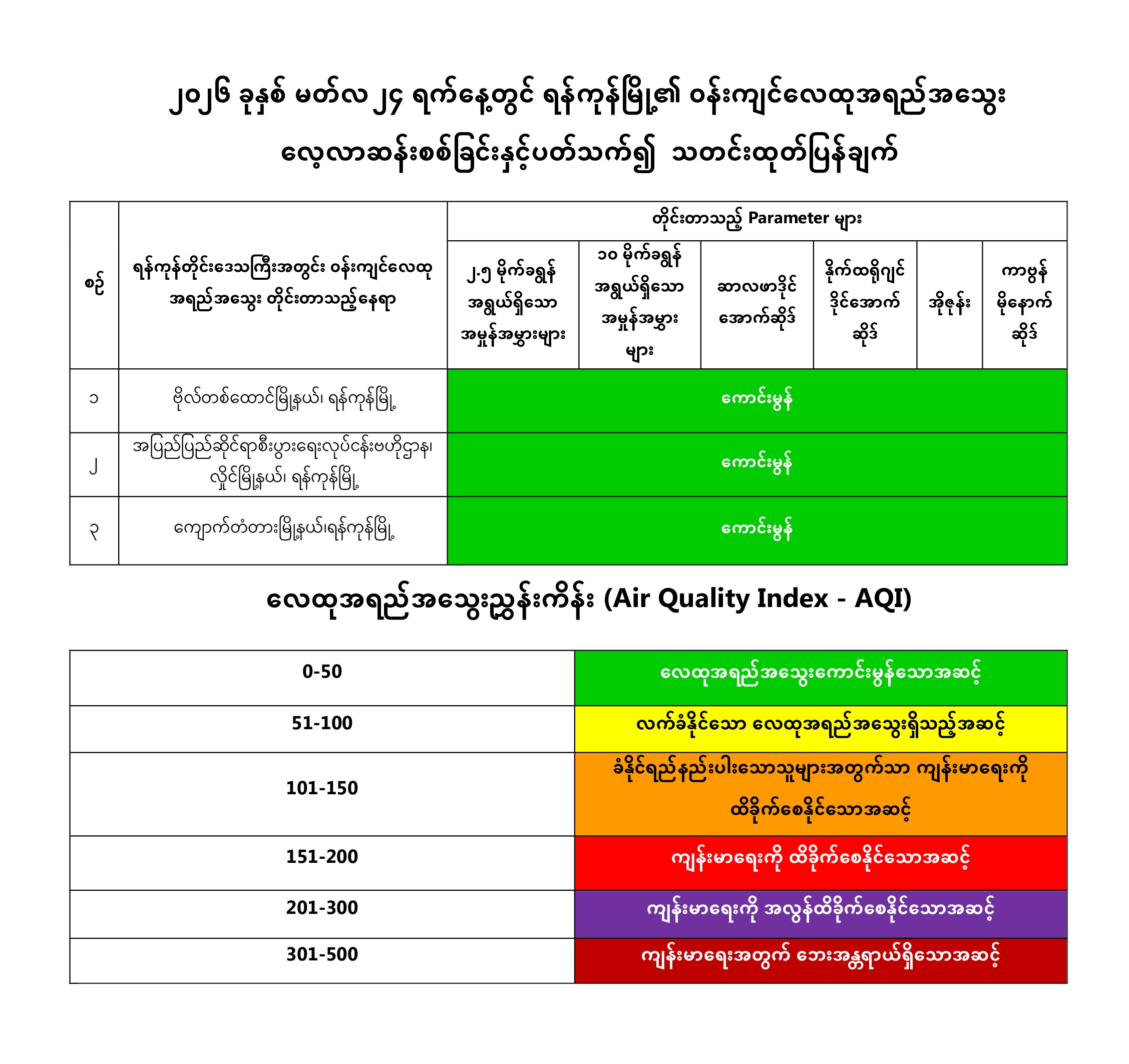 ရန်ကုန်တိုင်းဒေသကြီး၊ ပတ်ဝန်းကျင်ထိန်းသိမ်းရေးဦးစီးဌာနအနေဖြင့် ရန်ကုန်မြို့အတွင်း အောက်ဖော်ပြပါ တိုင်းတာမှတ် (၃) နေရာတွင် Ambient Air Quality Monitoring Station with Mobile Car- (AQMS Mobile Car)၊ Compact Air Quality Monitoring Station- (AQM 65) စက်များကိုအသုံးပြု၍ Particulate Matter 2.5 (PM2.5)၊ Particulate Matter 10 (PM10) ၊ Sulphur Dioxide (SO2)၊ Nitrogen Dioxide (NO2)၊ Ozone (O3) နှင့် Carbon Monoxide (CO) စသည့် အဓိက Parameter (၆) မျိုးကို (၂၄) နာရီ ပုံမှန်တိုင်းတာပြီး လေ့လာဆန်းစစ်လျက်ရှိပါသည်။