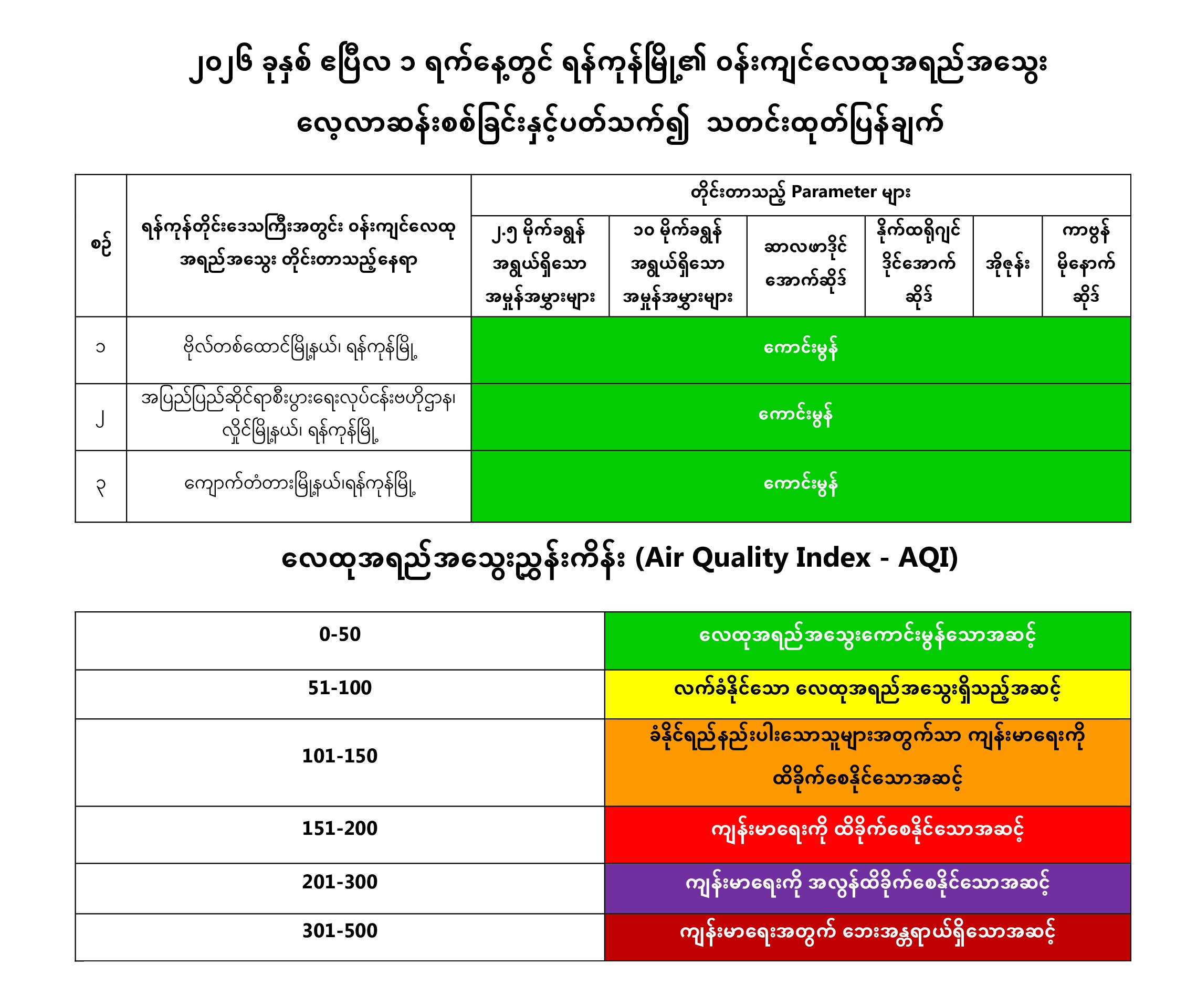 ၂၀၂၆ ခုနှစ် ဧပြီလ ၁ ရက်နေ့တွင် ရန်ကုန်မြို့၏ ဝန်းကျင်လေထုအရည်အသွေး လေ့လာဆန်းစစ်ခြင်းနှင့်ပတ်သက်၍ သတင်းထုတ်ပြန်ချက်