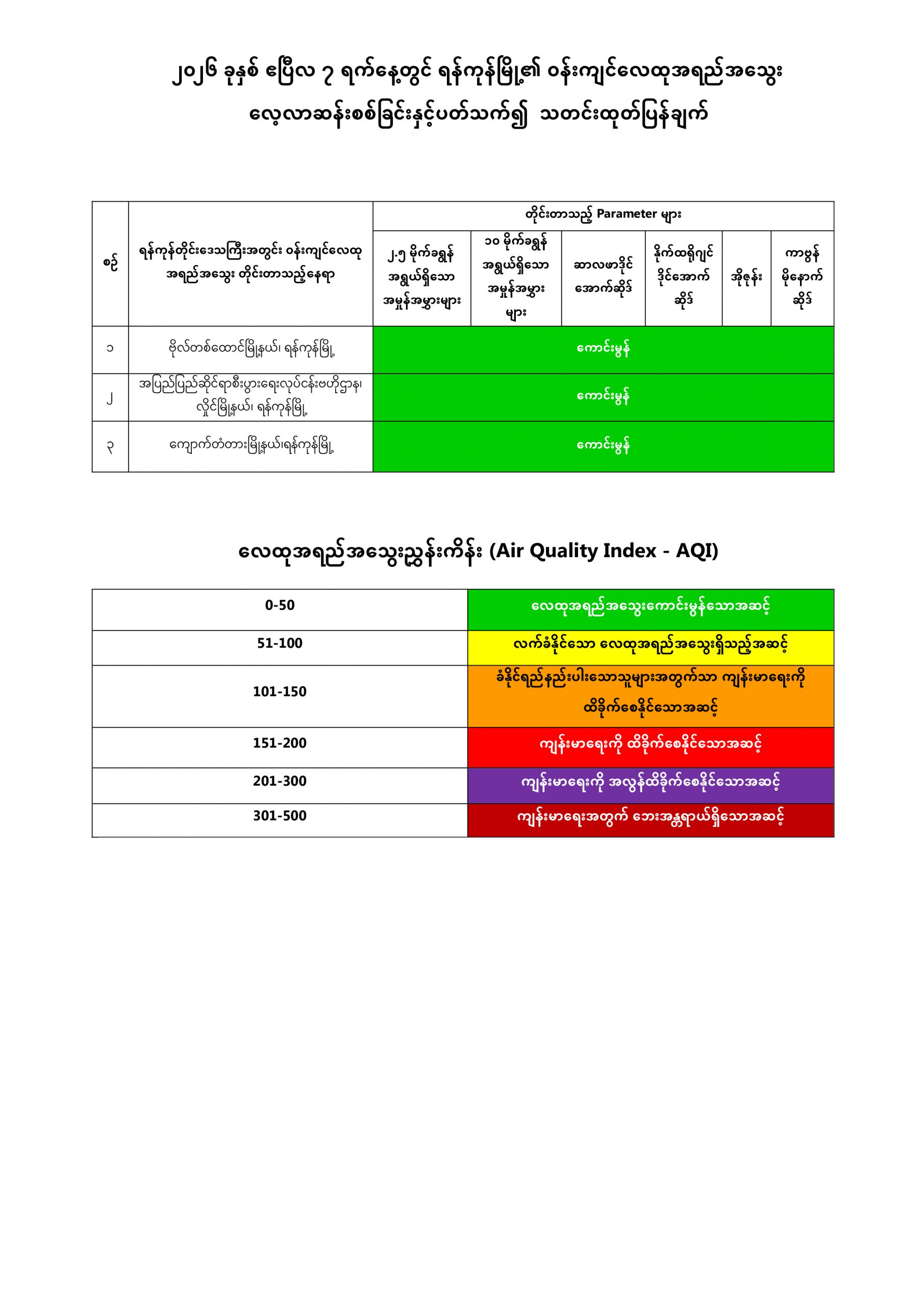 ရန်ကုန်တိုင်းဒေသကြီး၊ ပတ်ဝန်းကျင်ထိန်းသိမ်းရေးဦးစီးဌာနအနေဖြင့် ရန်ကုန်မြို့အတွင်း အောက်ဖော်ပြပါ တိုင်းတာမှတ် (၃) နေရာတွင် Ambient Air Quality Monitoring Station with Mobile Car- (AQMS Mobile Car)၊ Compact Air Quality Monitoring Station- (AQM 65) စက်များကိုအသုံးပြု၍ Particulate Matter 2.5 (PM2.5)၊ Particulate Matter 10 (PM10) ၊ Sulphur Dioxide (SO2)၊ Nitrogen Dioxide (NO2)၊ Ozone (O3) နှင့် Carbon Monoxide (CO) စသည့် အဓိက Parameter (၆) မျိုးကို (၂၄) နာရီ ပုံမှန်တိုင်းတာပြီး လေ့လာဆန်းစစ်လျက်ရှိပါသည်။